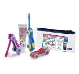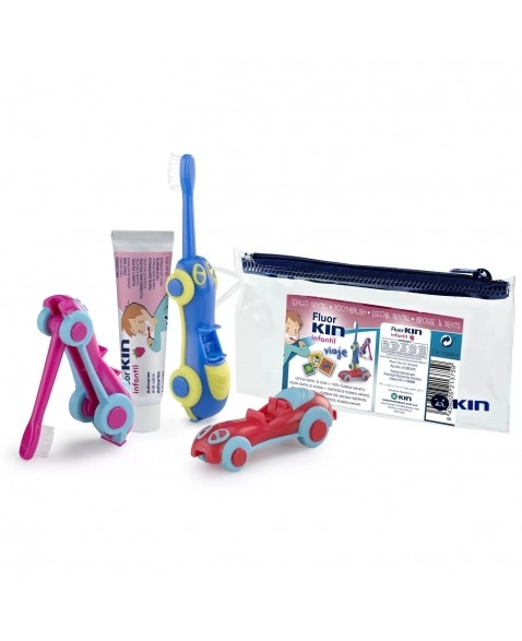 Toothbrush with an attractive car-shaped design in different colors makes brushing more fun. It includes, in a practical toiletry bag, the FluorKIN Children's strawberry flavour TOOTHPASTE that protects against caries and strengthens enamel.