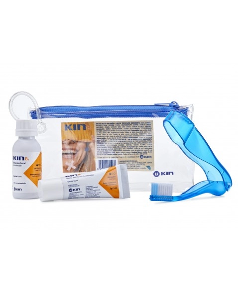Trousse composée d'une trousse de toilette, d'une brosse de voyage KIN, d'un dentifrice KIN B5 7g et d'un bain de bouche KIN B5 15 ml, afin de maintenir une hygiène bucco-dentaire même hors de chez soi.